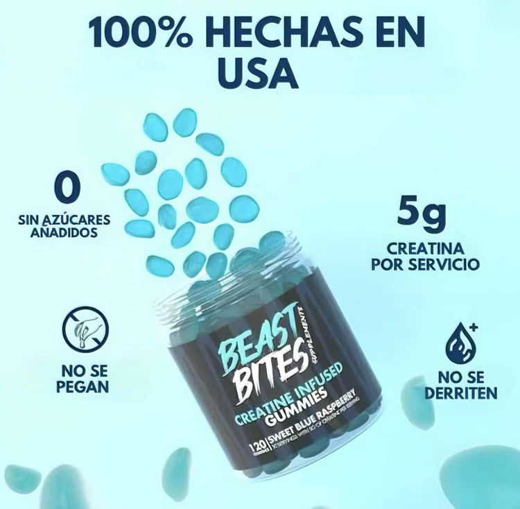 Transforma tu entrenamiento con Beast Bites, las gomitas con Creatina Monohidrato diseñadas para brindarte los mismos beneficios de desarrollo muscular que los polvos tradicionales, pero de manera más sabrosa y práctica. ¡Dile adiós a los polvos aburridos y mejora tu rendimiento físico con cada mordisco!